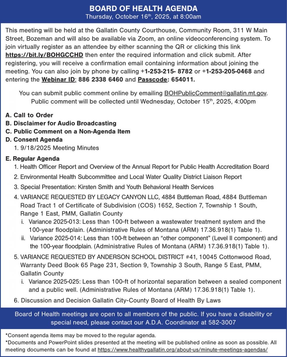 406-582-3100215 W Mendenhall StBozeman, MT 59715(Gallatin County Health Department)