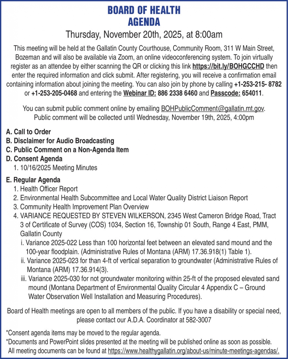 Nov 15, 2025. Gallatin City-County Health Department Events Ads from The Bozeman Daily Chronicle
