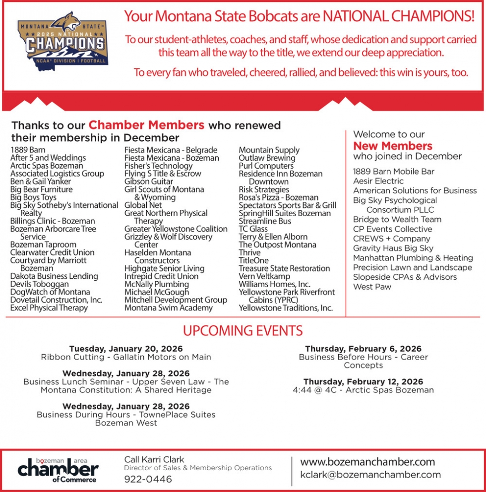 Jan 20, 2026. Bozeman Area Chamber of Commerce Organizations Ads from The Bozeman Daily Chronicle