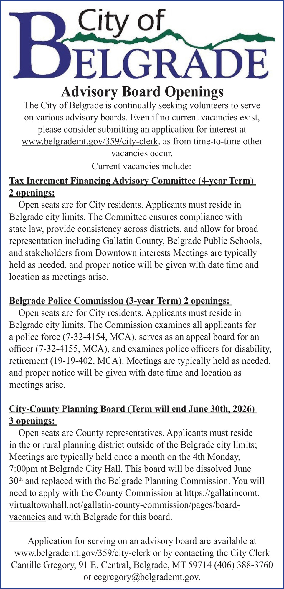 Feb 05, 2026. City of Belgrade Jobs Ads from The Bozeman Daily Chronicle